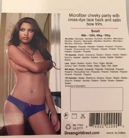 Dream girl royal/gold small microfiber cheeky panties with cross -dye lace back and satin bow trim 900lb – 120lb , 40 KG – 55 KG