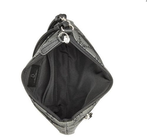 Exterior features silver-tone hardware, logo plaque, 1 front zip pocket and 1 back magnetic snap pocket
